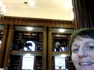 Why am I telling you this when I have two big, fat papers to write? Because I have two big, fat papers to write, that’s why! Here: I’ll even take another picture of the room so you can see how it’s a two-story room with little individual study areas on both floors. Aren’t those carved wooden columns lovely?